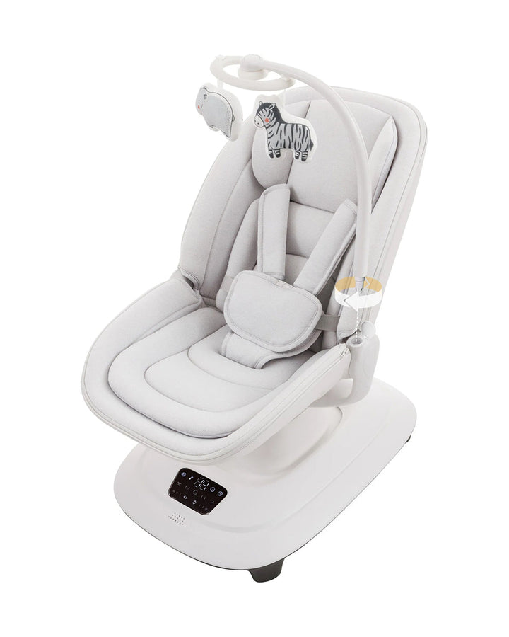 "هدوء وترفيه من كل زاوية - قم بتدوير المهد 360 بسهولة° لراحة الأطفال المضطربين أو إشراك المستكشفين الفضوليين.اختر من بين 5 سرعات هزازة سلسة و3 أوضاع للحركة (التمرير/الضغط/التشغيل) مع محرك هادئ للغاية – مثالية لوقت القيلولة أو وقت اللعب دون إزعاج المنزل.